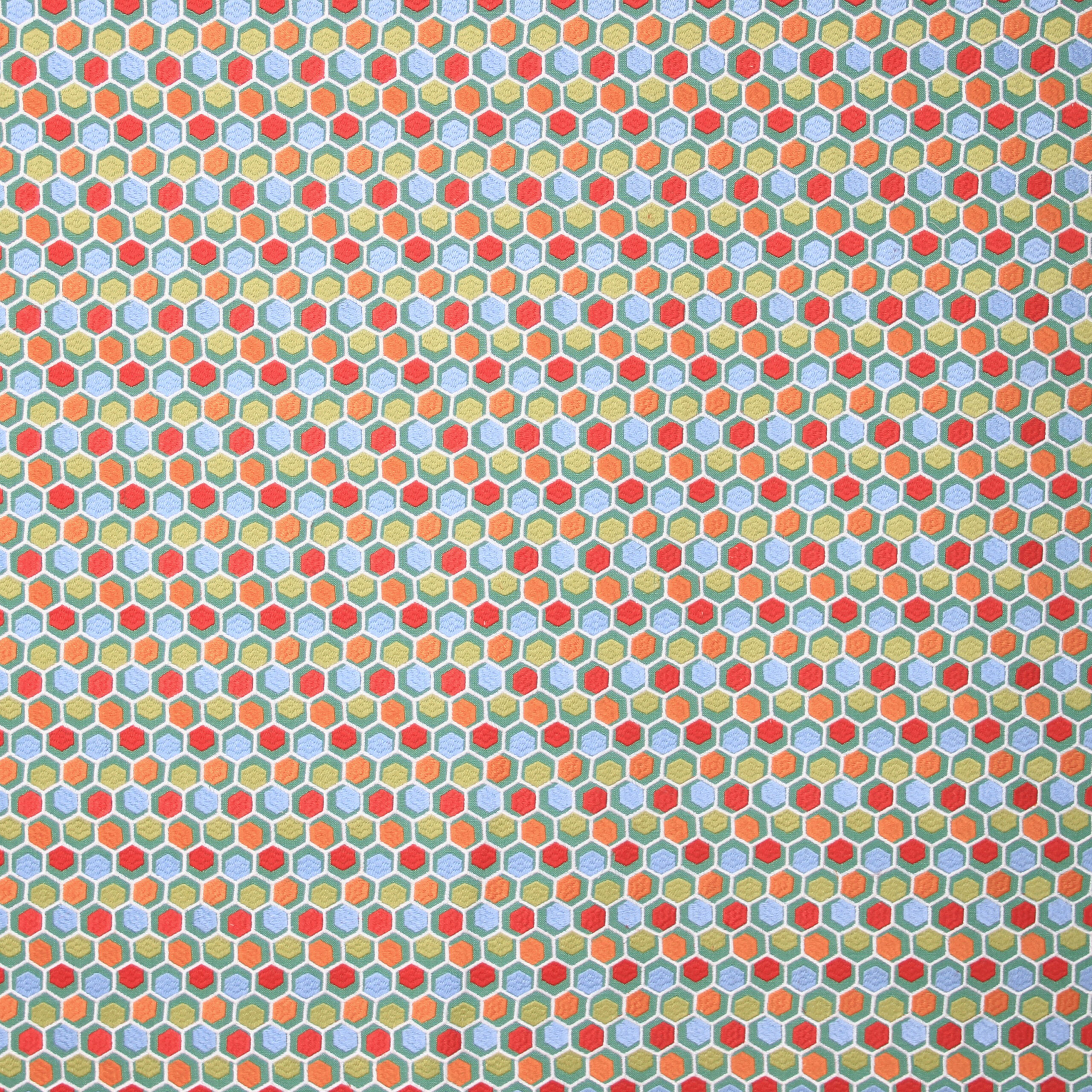 AZMARA features a structured grid of embroidered hexagons in vibrant gemstone tones, set against a lush green base. The crisp white outlines create a striking contrast, evoking the look of stylized honeycombs or the facets of a cut crystal. With its rhythmic geometry and 100% inherently flame-retardant composition, AZMARA brings clarity, color, and structural charm to modern drapery and decorative cushions.